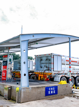 CNG充裝區(qū)配備高效加氣柱,站內(nèi)設(shè)施設(shè)計(jì)日充裝能力達(dá)115萬(wàn)立方米。天然氣經(jīng)過(guò)精密調(diào)壓、脫水及壓縮工藝處理后,通過(guò)專業(yè)CNG槽車完成充裝與加注,服務(wù)覆蓋工業(yè)與車用燃?xì)馐袌?chǎng)。